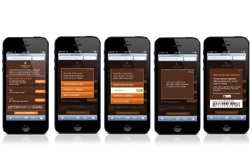 I designed a mobile experience that gives hotel guests easy access to exclusive in-hotel offers right on their phones. The interface includes clear offer details, simple barcode redemption, and options to receive reminders by email, text, or Passbook.