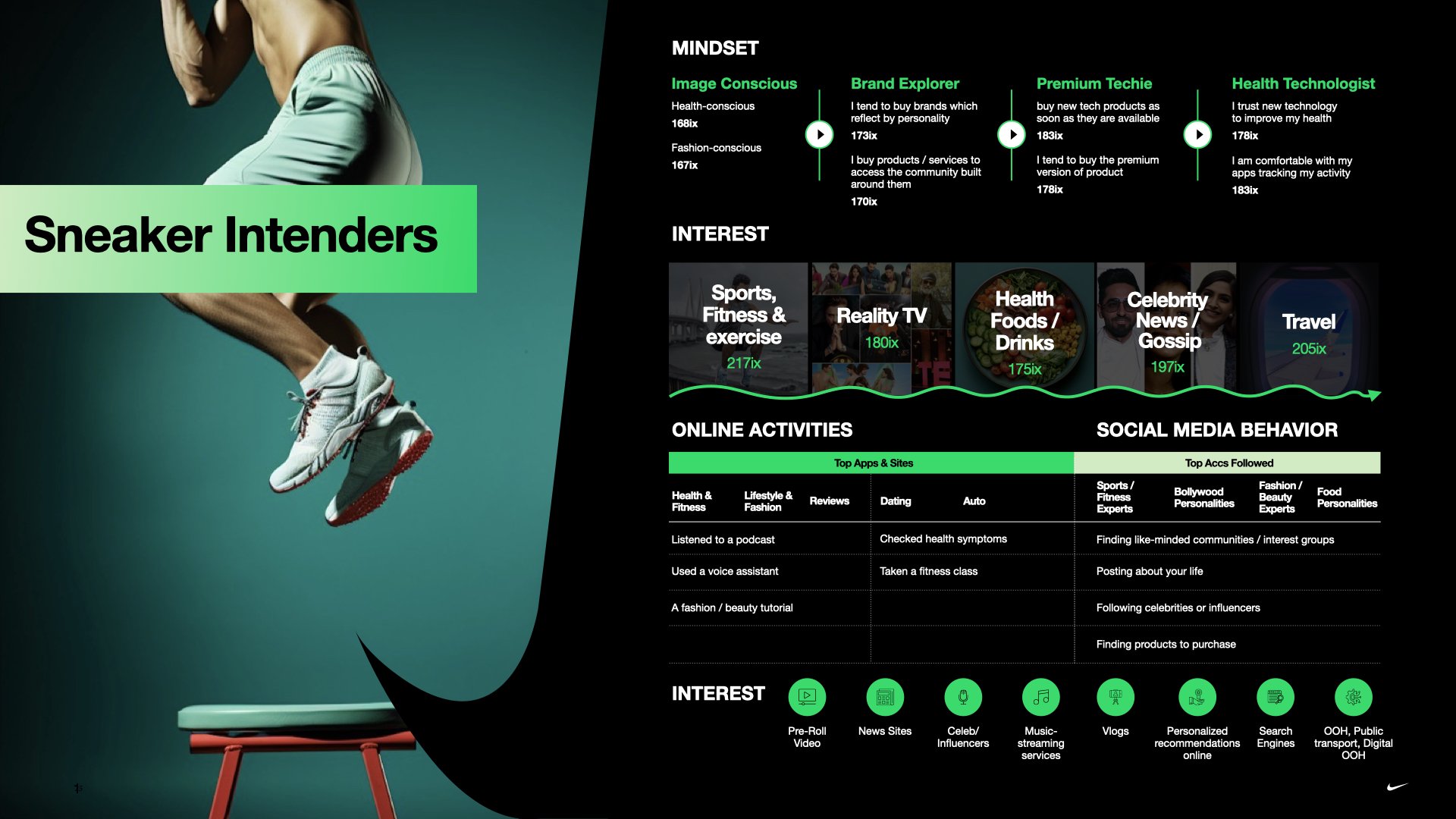 A high-energy strategic deck built with bold typography, grayscale photography, and Nike’s signature neon green accents. The system translates complex 1st party data strategy into clear, impactful storytelling. I created a full master build with modular layouts, audience frameworks, and data visuals that keep the narrative sharp, athletic, and true to the Nike brand.