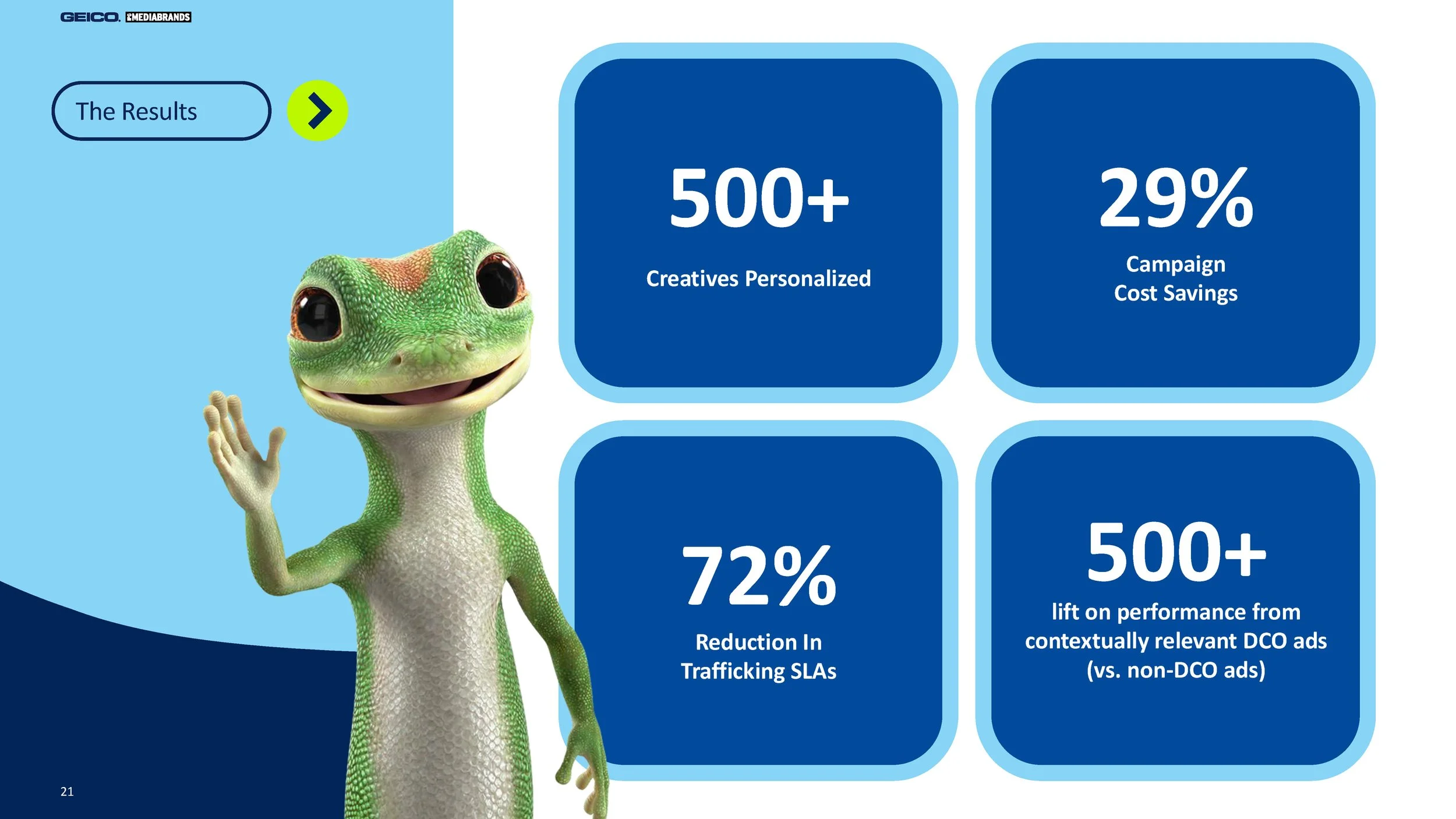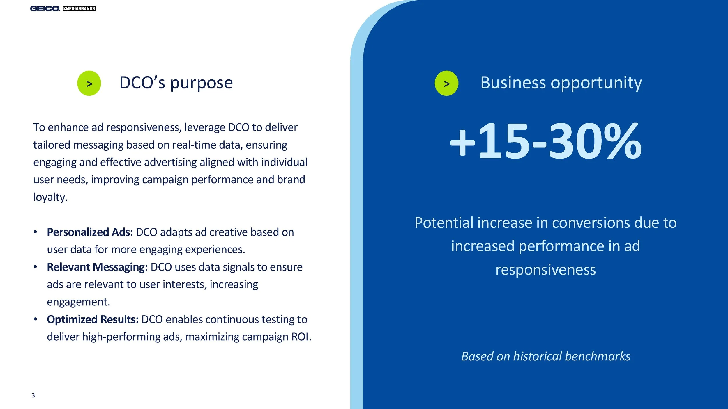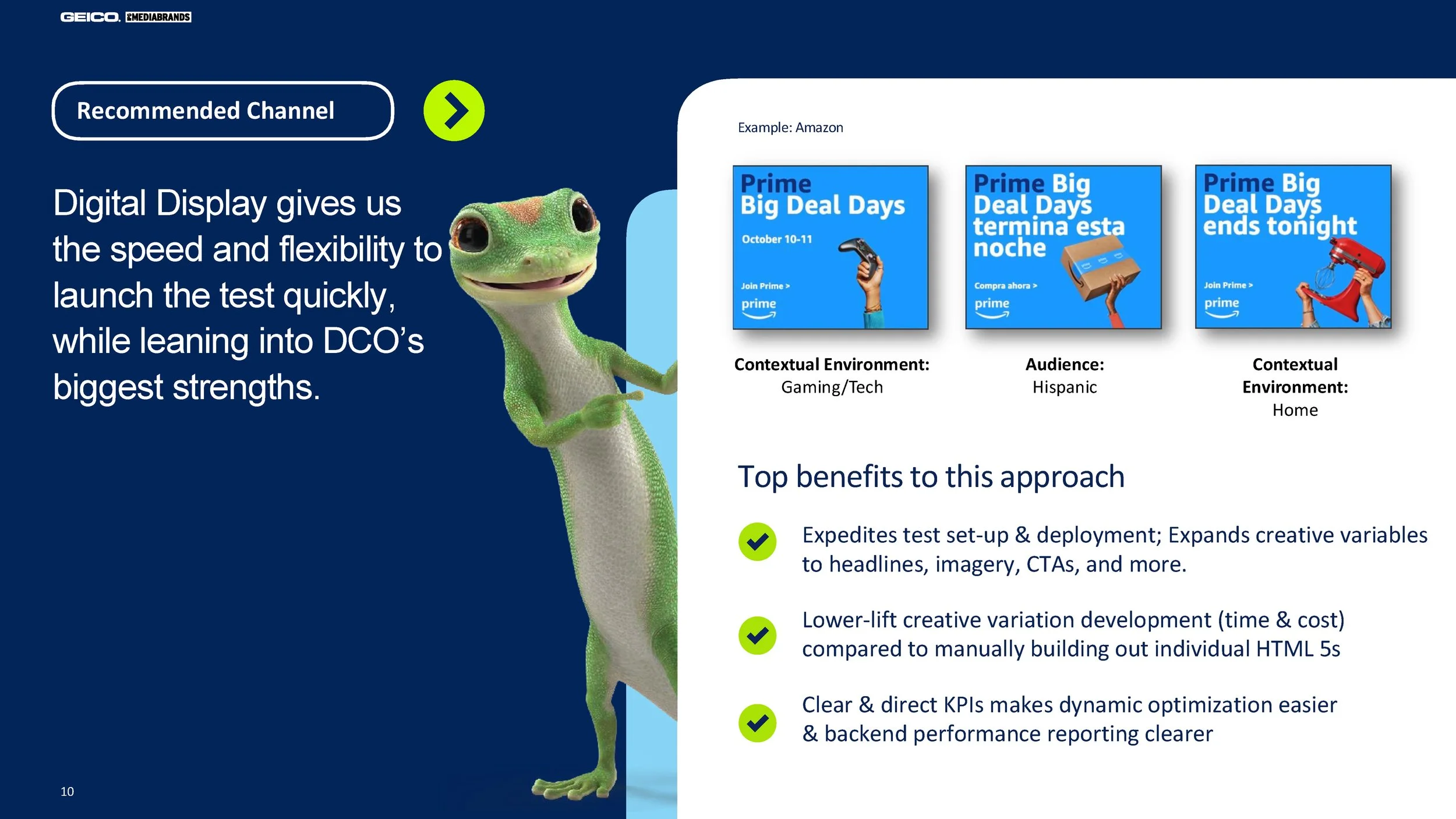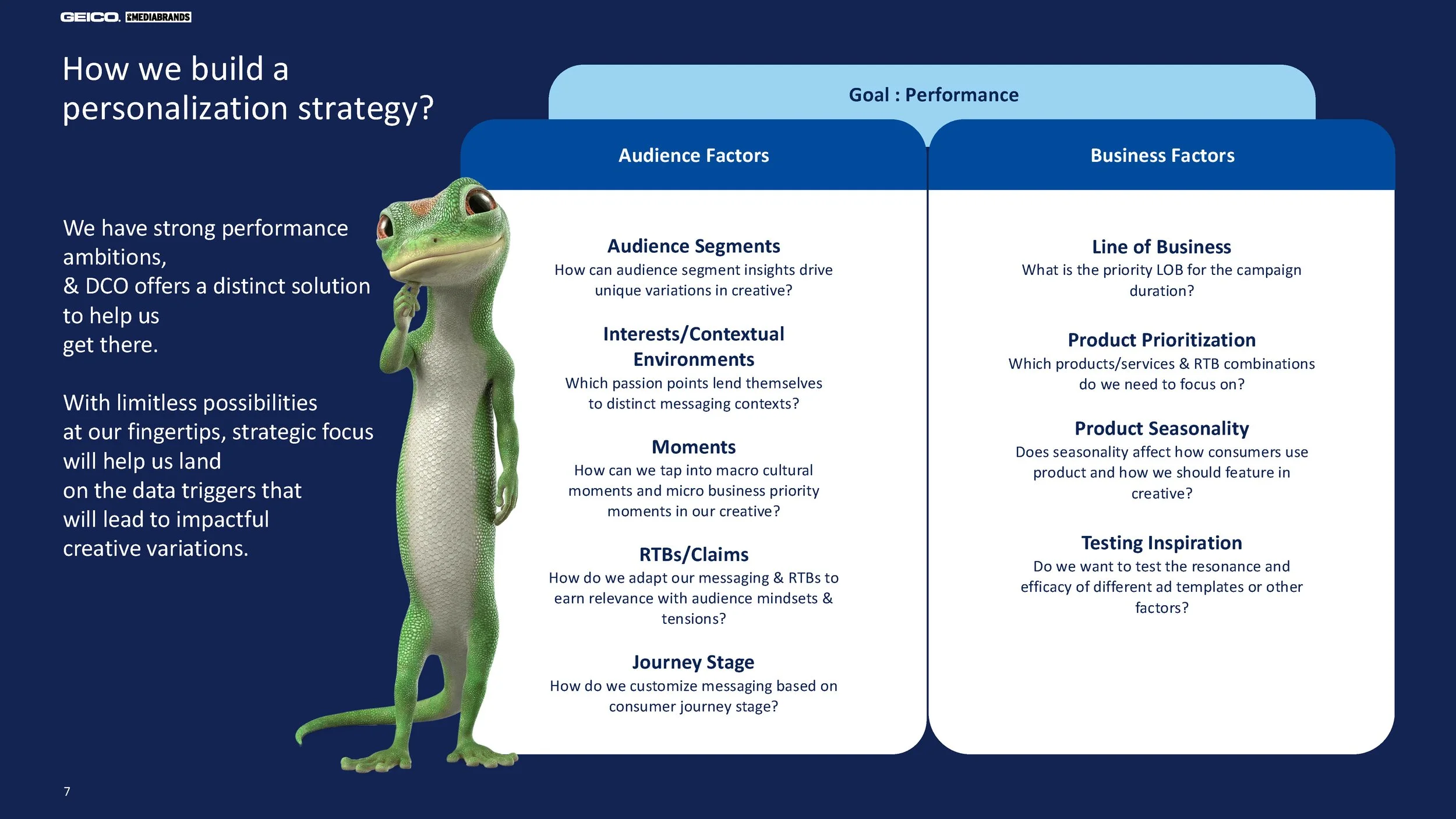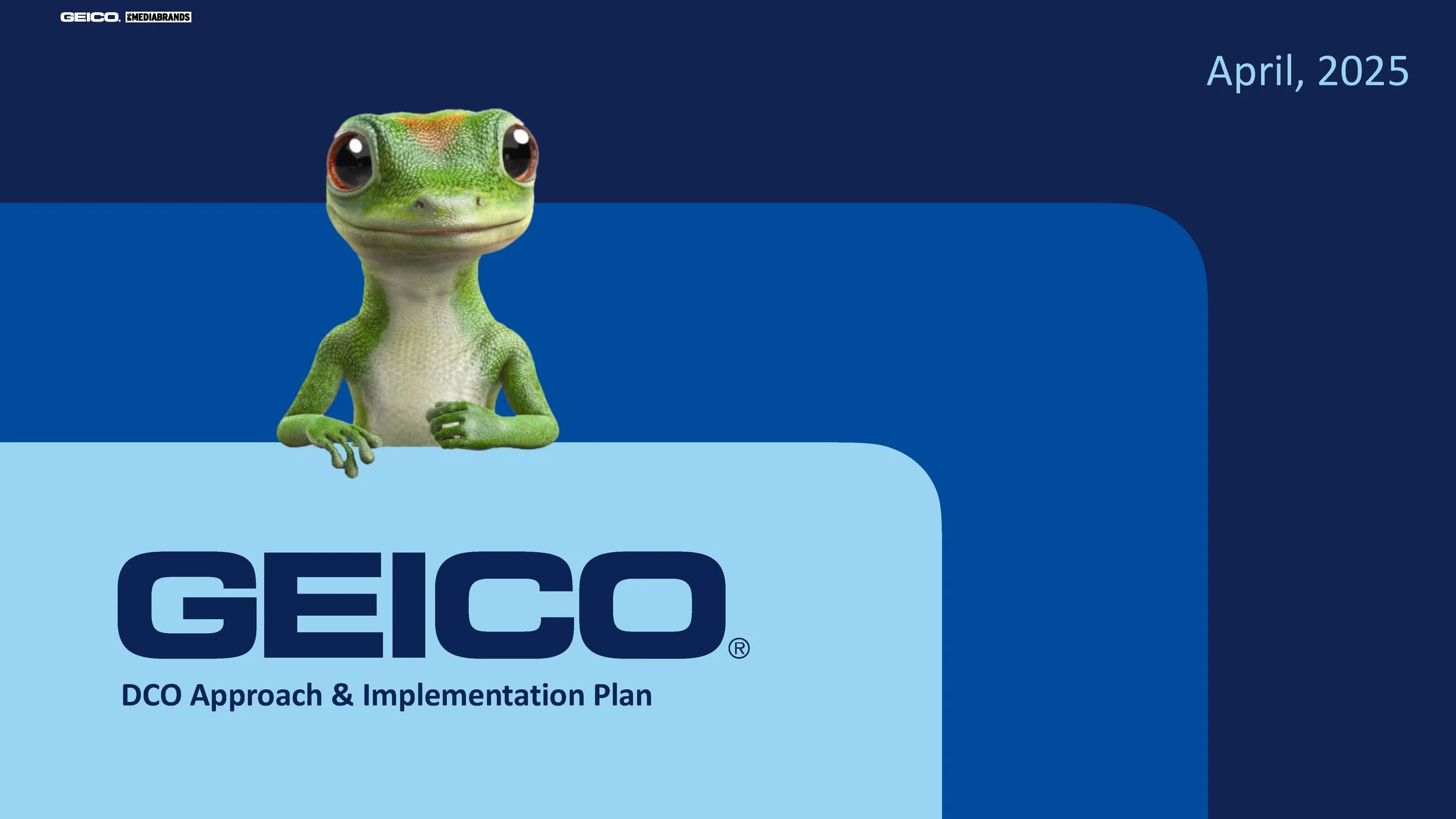 A clean, approachable deck built around GEICO’s friendly brand identity and the iconic gecko. The design uses rounded shapes, bright blues, and simple visual frameworks to make a complex DCO strategy easy to understand. I created a full master system with modular slides for workflows, timelines, personalization models, and performance results, ensuring the deck is both highly functional and aligned with GEICO’s recognizable visual style.